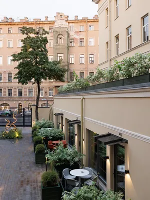 Отель имеет зеленый двор, куда выходят номера-виллы с собственной мини террасой и отдельным входом, Размещение в номерах вилах возможно с собаками за дополнительную плату.