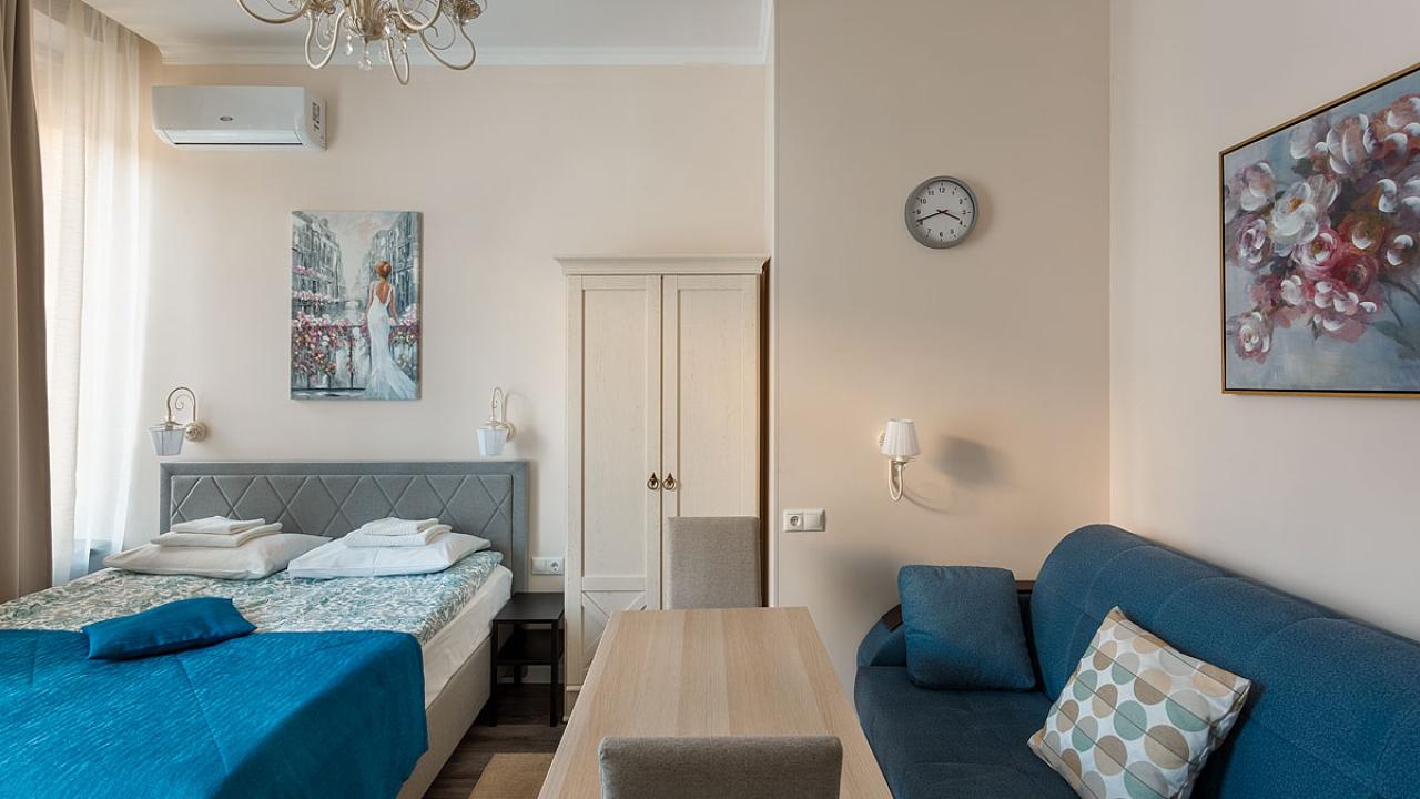 Отличные апартаменты, большая кровать, кондиционер. Удобная планировка. Привлекательный дизайн. Отличные условия для крепкого сна и проживания в целом. Рядом магазины и кафе. Персонал внимателен к гостям, обслуживание отличное, отель чистый.