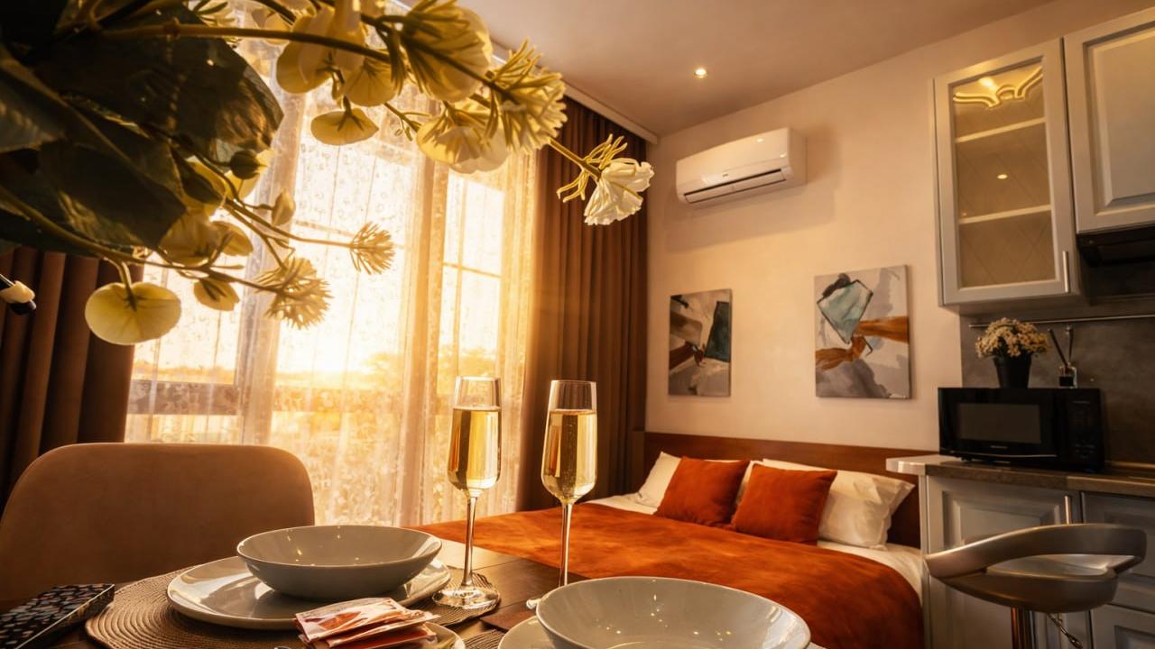 Отличные апартаменты, большая кровать, кондиционер. Удобная планировка. Привлекательный дизайн. Отличные условия для крепкого сна и проживания в целом. Рядом магазины и кафе. Персонал внимателен к гостям, обслуживание отличное, отель чистый.