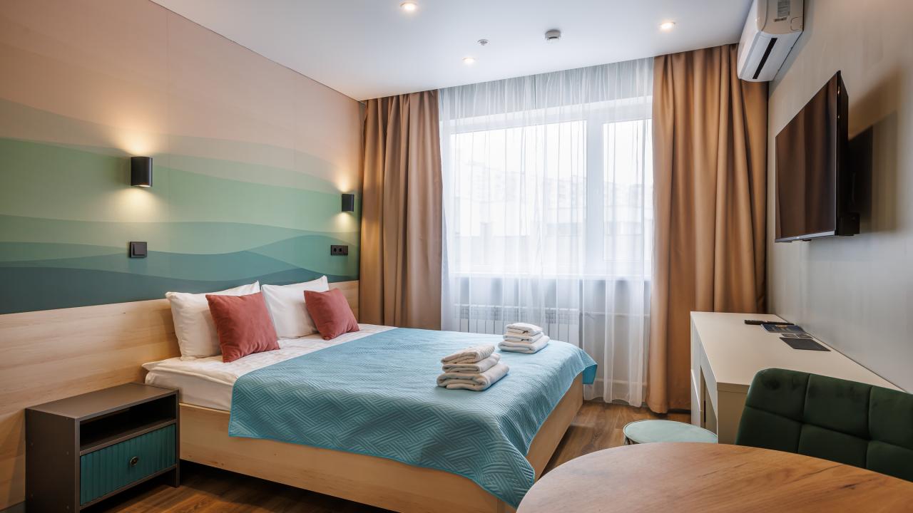 Отличные апартаменты, большая кровать, кондиционер. Удобная планировка. Привлекательный дизайн. Отличные условия для крепкого сна и проживания в целом. Рядом магазины и кафе. Персонал внимателен к гостям, обслуживание отличное, отель чистый.