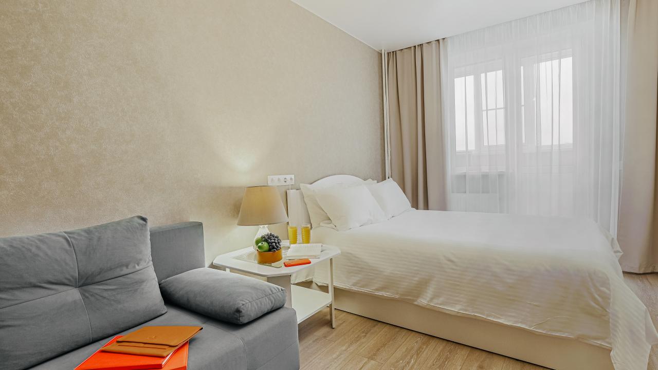 Гостиничный комплекс находится в жилом комплексе. Это симпатичное место, этакие апартаменты-студия. В номере есть комната с четырьмя спальными местами: 2 + 2. Для семьи вполне годится. Свой санузел, полноценный, которым приятно пользоваться. Кухонный уголок со всем нужным. Так что проблем не было.