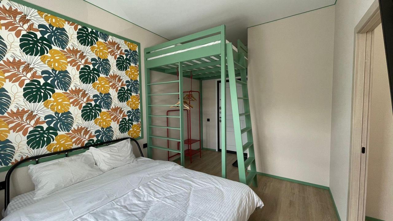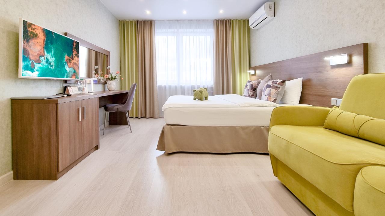 Гостиничный комплекс находится в жилом комплексе. Это симпатичное место, этакие апартаменты-студия. В номере есть комната с четырьмя спальными местами: 2 + 2. Для семьи вполне годится. Свой санузел, полноценный, которым приятно пользоваться. Кухонный уголок со всем нужным. Так что проблем не было.