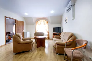 3-х комнатный полулюкс. Во всех номерах есть телевизор со спутниковым ТВ, холодильник, кондиционер, шкаф‑купе для одежды, фен, полностью укомплектованная собственная ванная комната. Также предоставляются гладильные принадлежности.